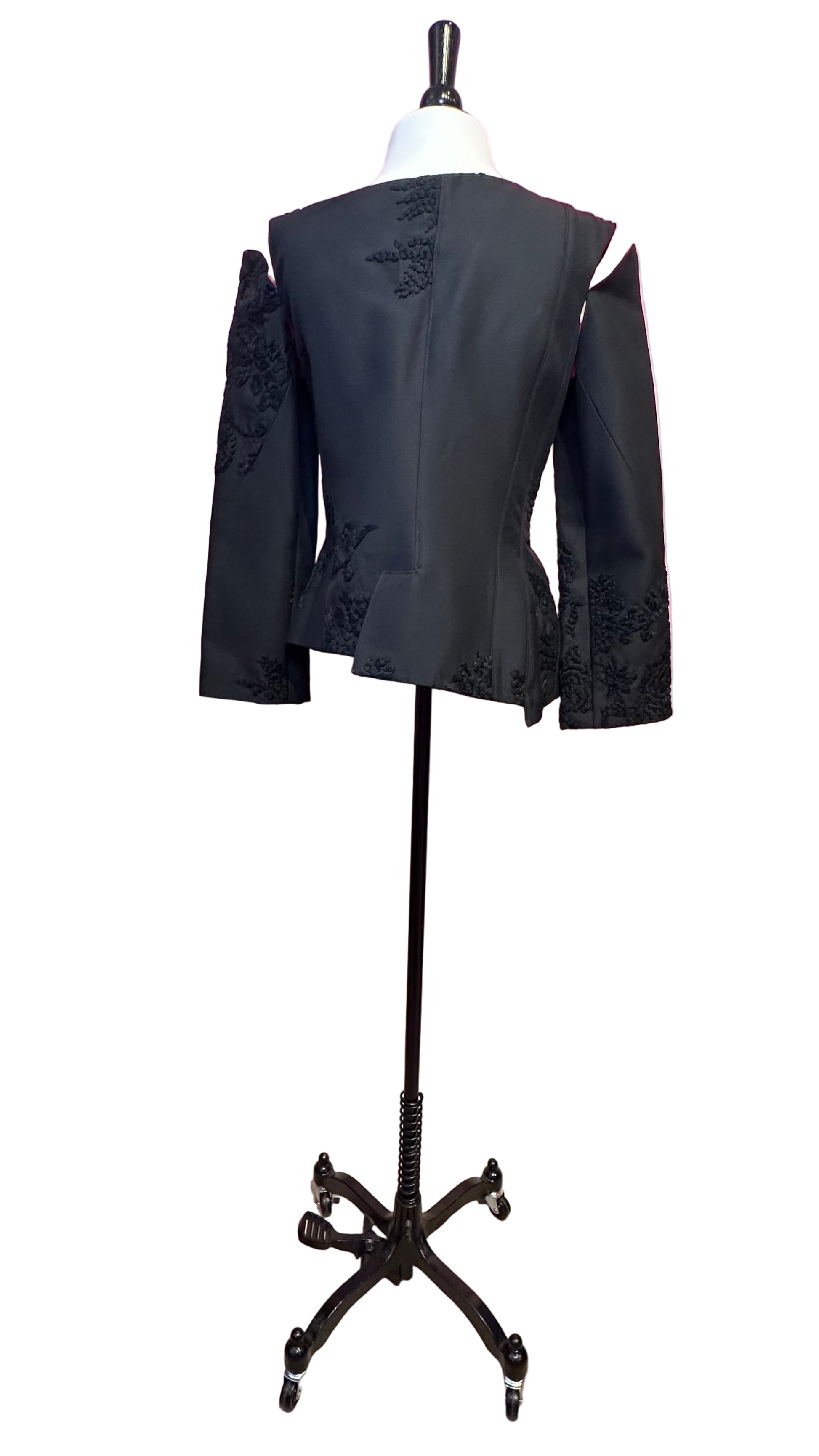 Black, floral embroidery, cotton, silk, detachable sleeves, hot pink lining, fitted, tailored blazer, jacket, princess seams, asymmetric neckline